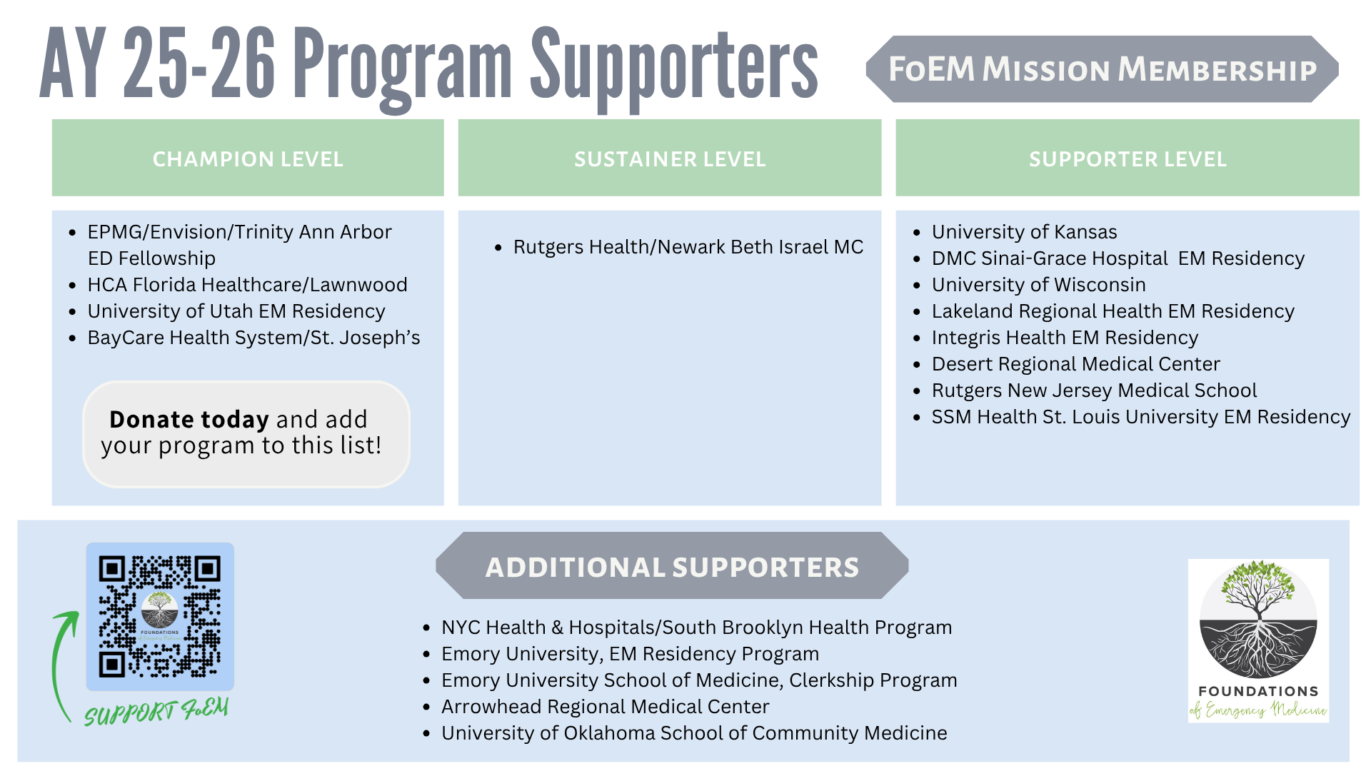 FoEM would not exist, and could not be sustained, without funding to cover operational costs.  We are asking for capable programs to invest in our mission and ensure our sustainability.  If you or your program find value in our work and have the means, we’d appreciate a financial contribution from your program.  FoEM Mission Member Programs will be recognized on our website at three levels: FoEM Supporter, FoEM Sustainer, and FoEM Champion.